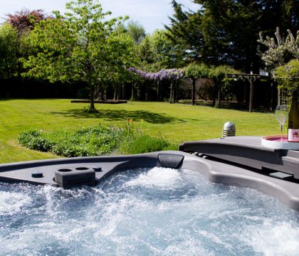 Hot tub for six, patio with multiple outdoor seating options, charcoal BBQ, unenclosed pond and stone well
