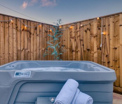 Patio, lawn, charcoal BBQ, hot tub and outdoor bistro set seating two
